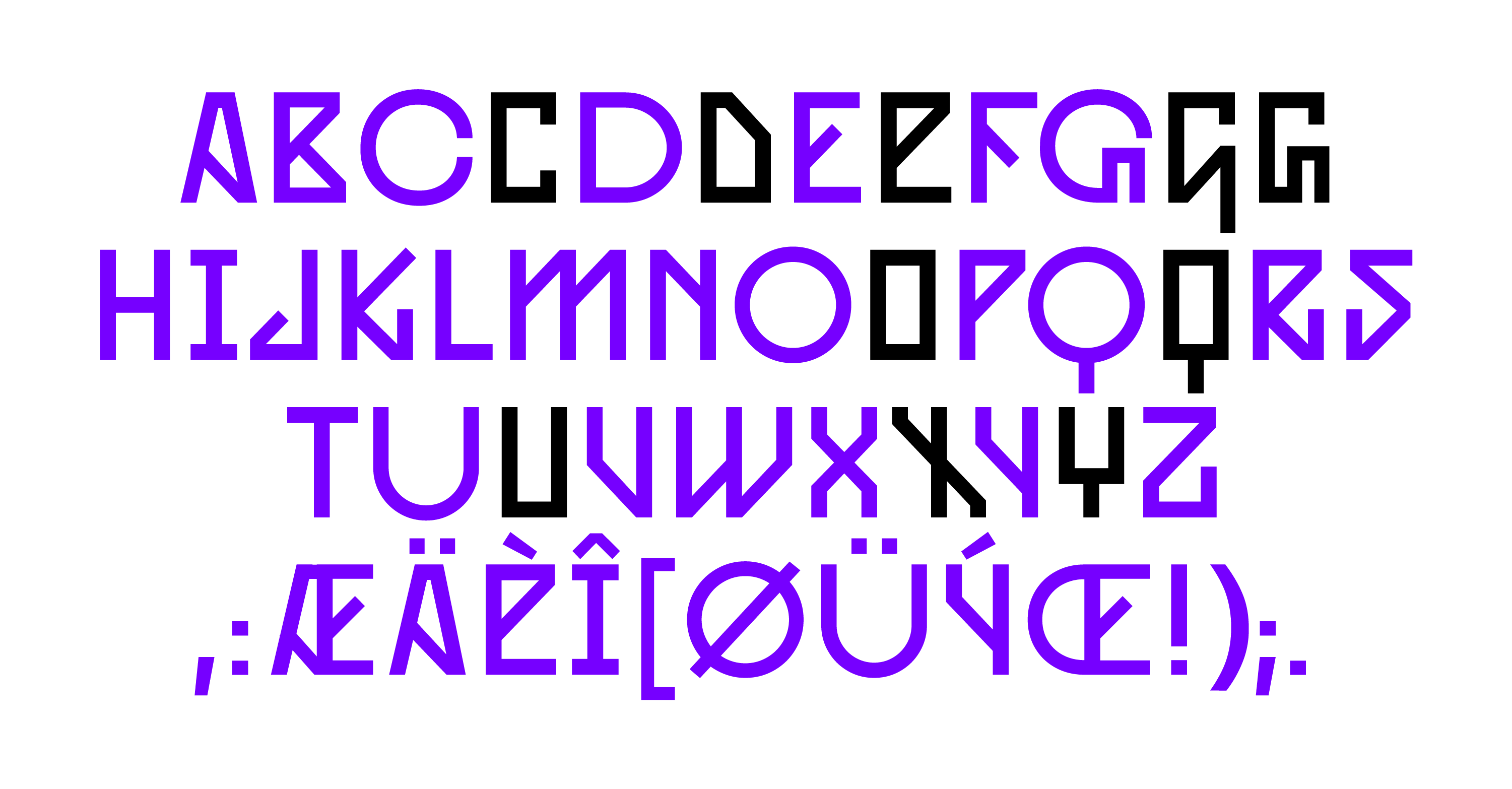 Strongly inspired by the Etruscan alphabet, this typeface is characterized by the constant use of slanted strokes and acute angles alternating with pure geometric forms like circles.